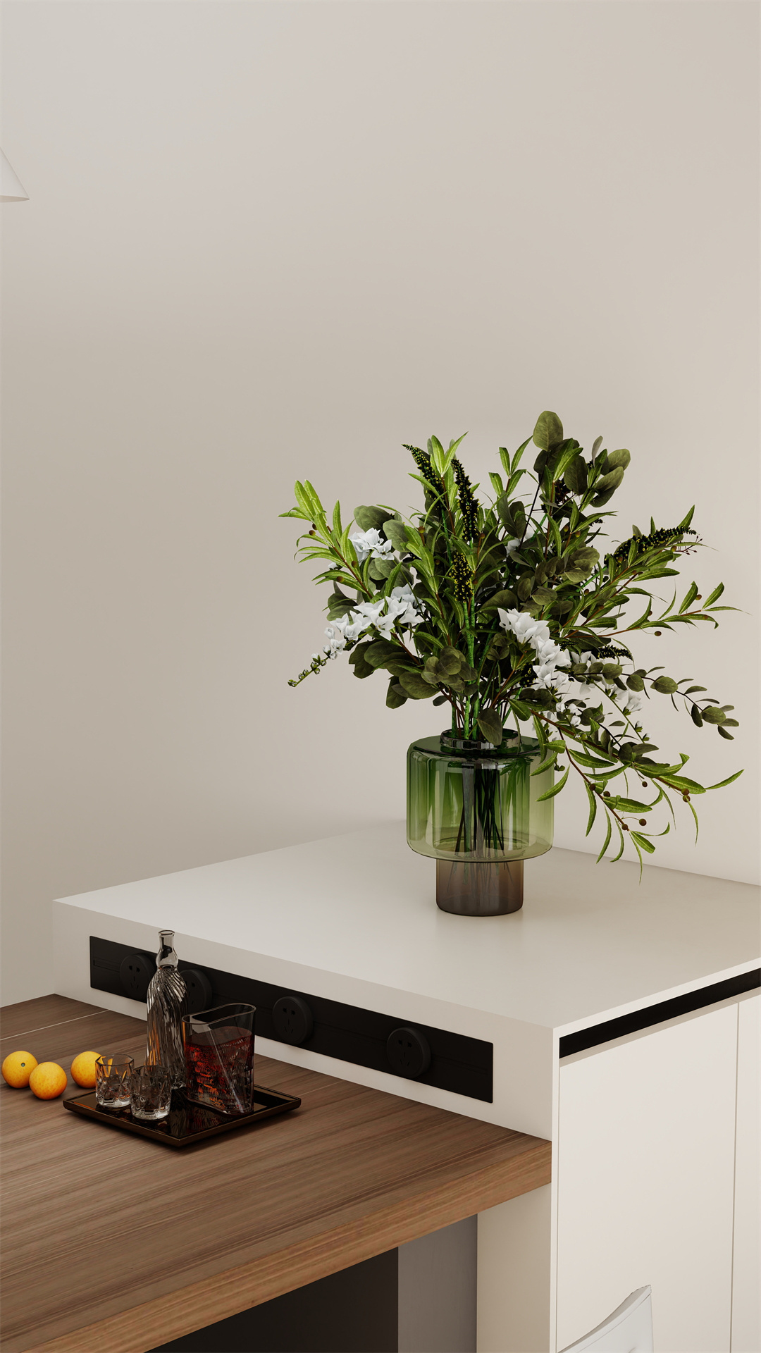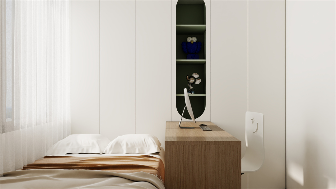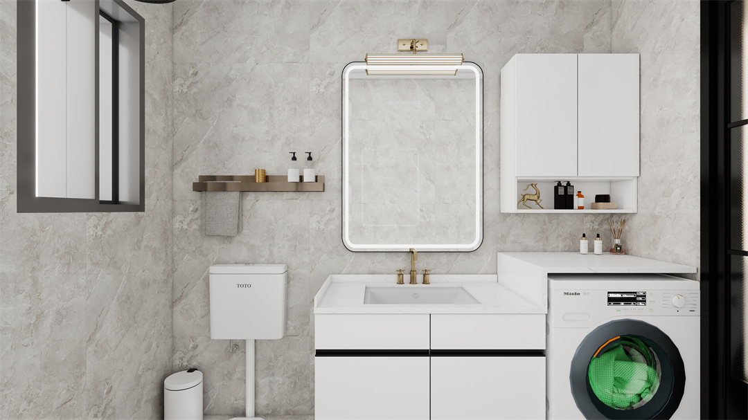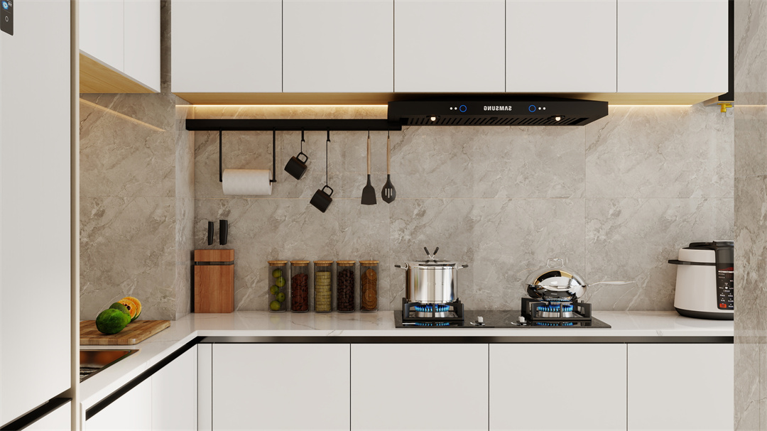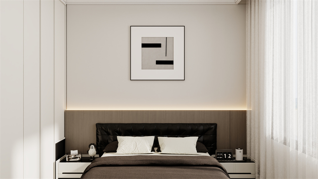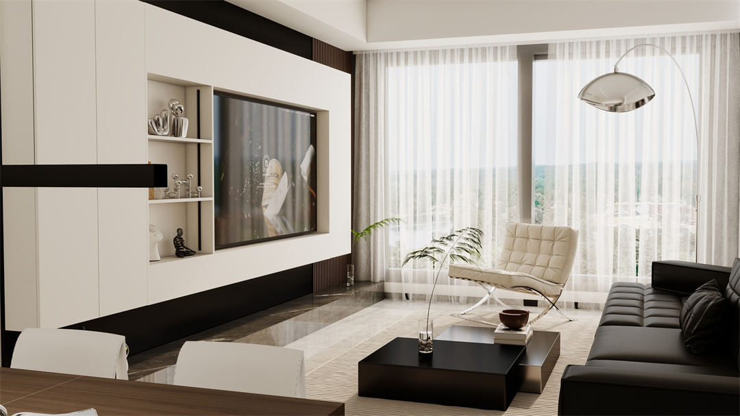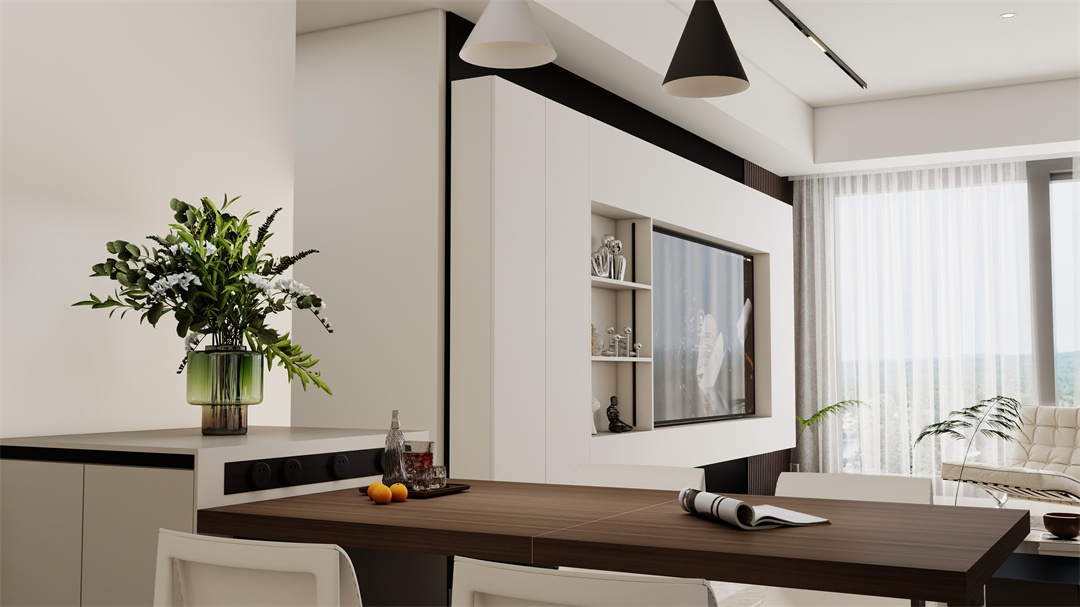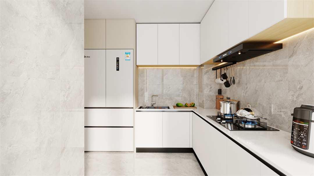 • 本套 100㎡现代风住宅设计,以简洁、时尚为核心。客厅采用黑白灰为主色调,搭配简约的家具与线条感十足的装饰,营造出大气通透的空间感。厨房整体为白色系,利用合理的布局和充足的收纳空间,打造出整洁有序的烹饪环境