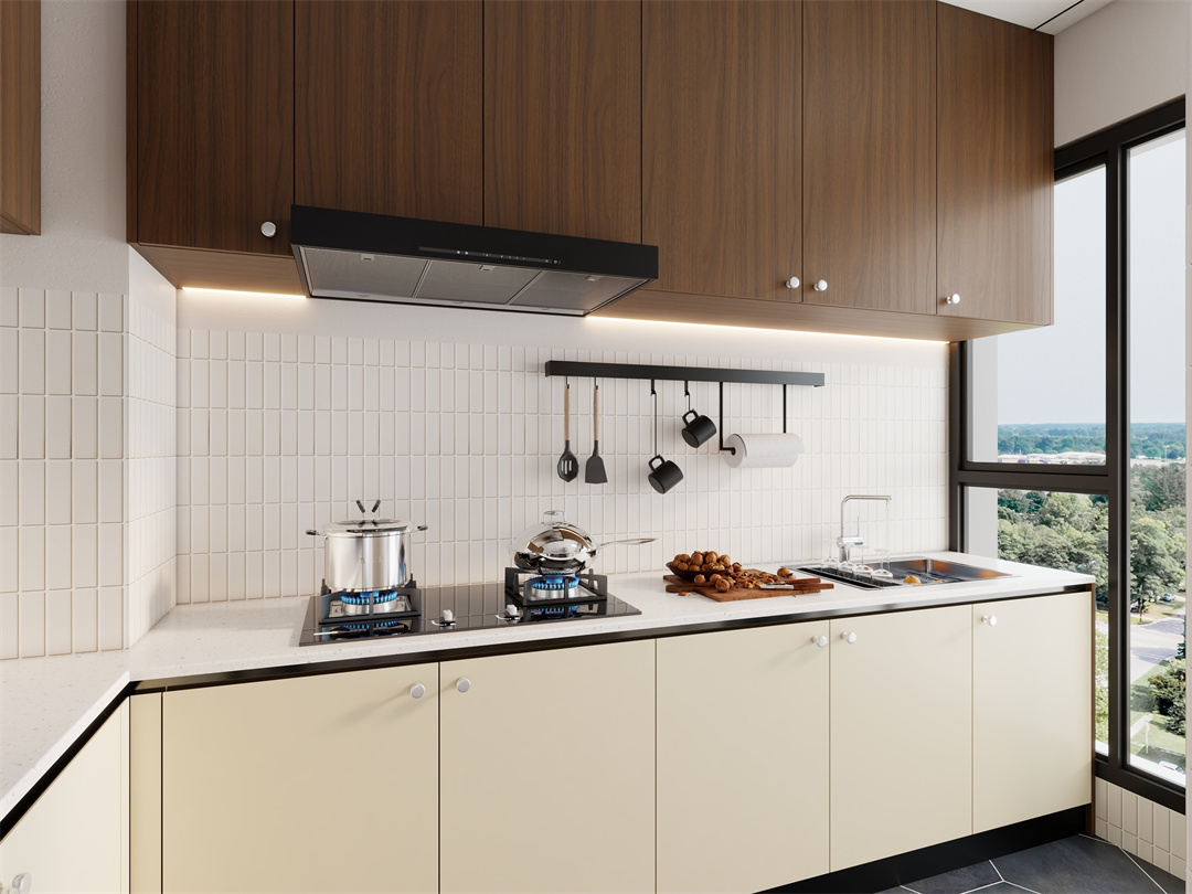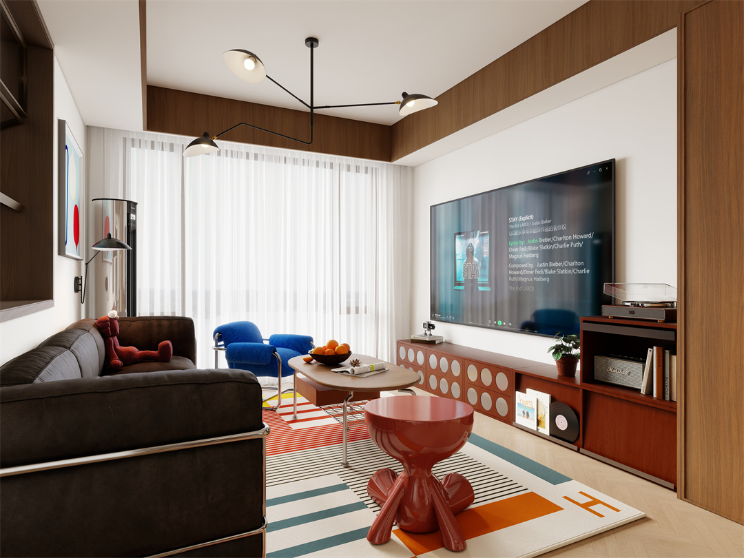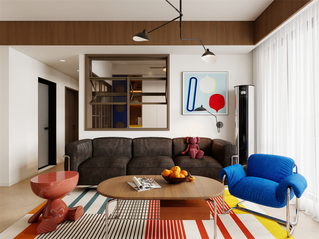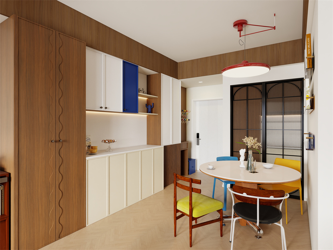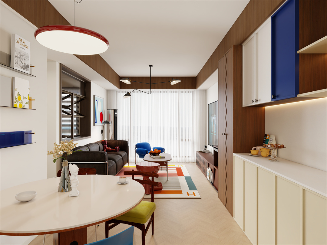 • 客厅运用深棕沙发、蓝色单人椅与多彩地毯的组合,搭配造型独特的灯具和艺术感十足的装饰画,复古中透着潮流活力。餐厅区域的圆形餐桌搭配色彩斑斓的餐椅,红色吊灯极具视觉冲击力,木质元素的融入又增添了一份温暖质感。厨房采用木色与米色橱柜的搭配,白色瓷砖墙面简洁干净,悬挂的黑色厨具实用且具设计感,营造出复古又现代的烹饪空间。