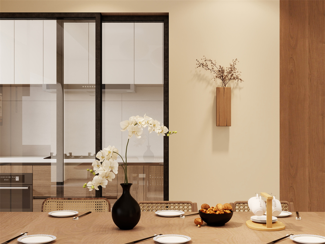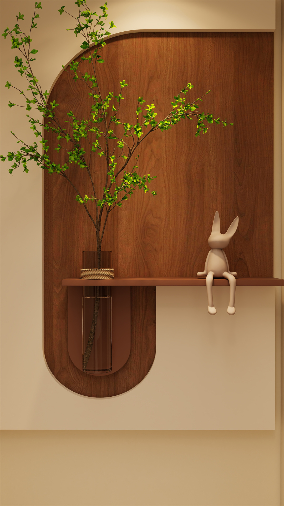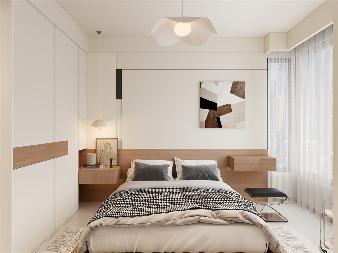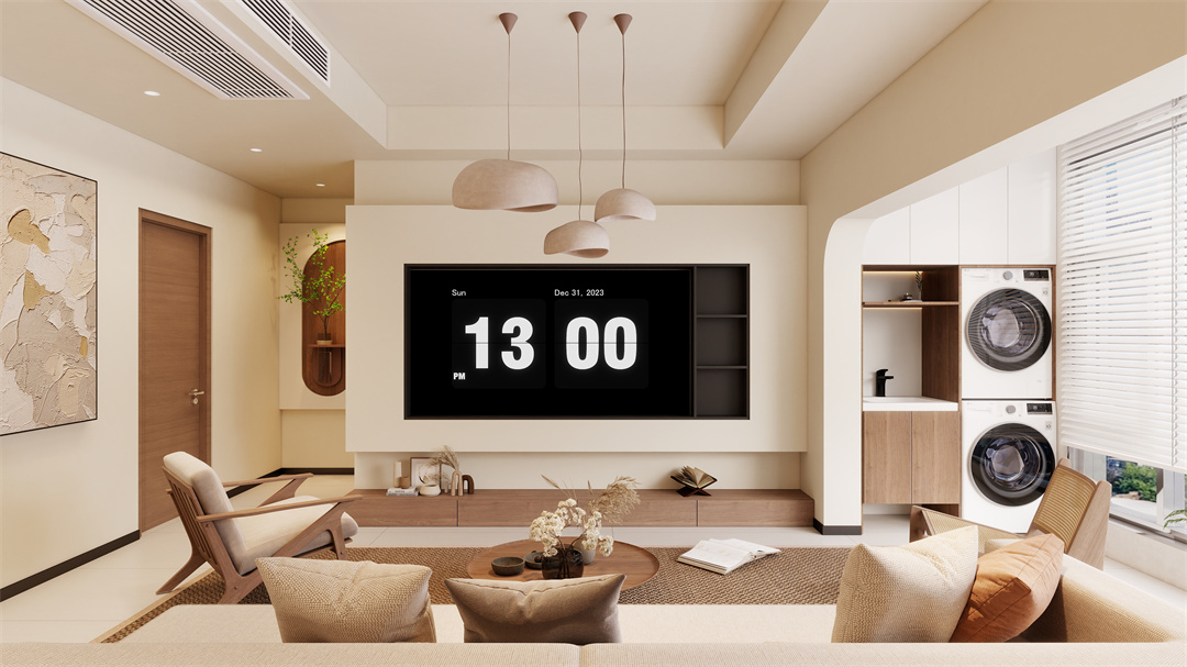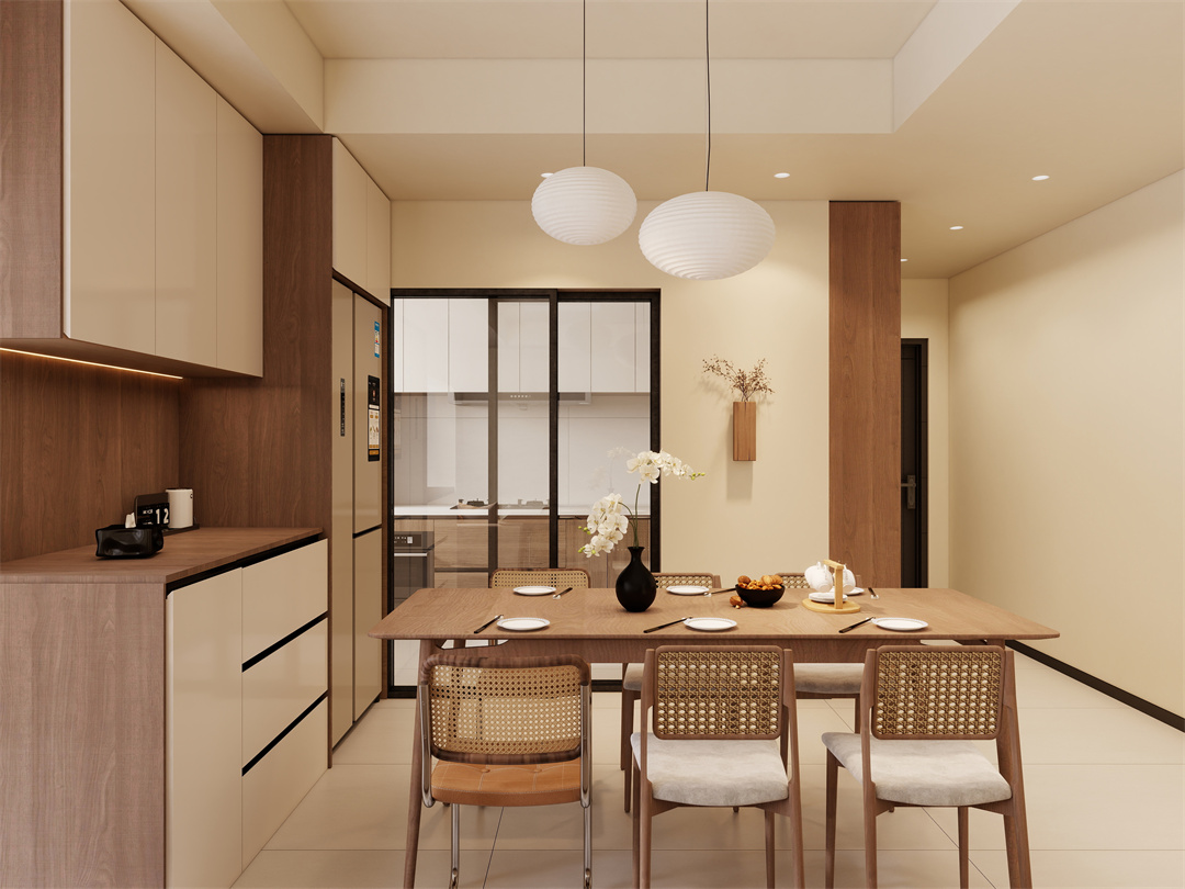 • 客厅以奶油色系为主基调,搭配木质元素的家具与装饰,如木质茶几、电视柜,传递出自然质朴的侘寂韵味。造型独特的米色吊灯与简约的电视背景墙设计相呼应,搭配干花、艺术摆件等软装,为空间增添了一份温馨与艺术感。整体布局通透,通过柔和的色彩与自然的材质,打造出一个舒适宜居、富有格调的现代家居环境。